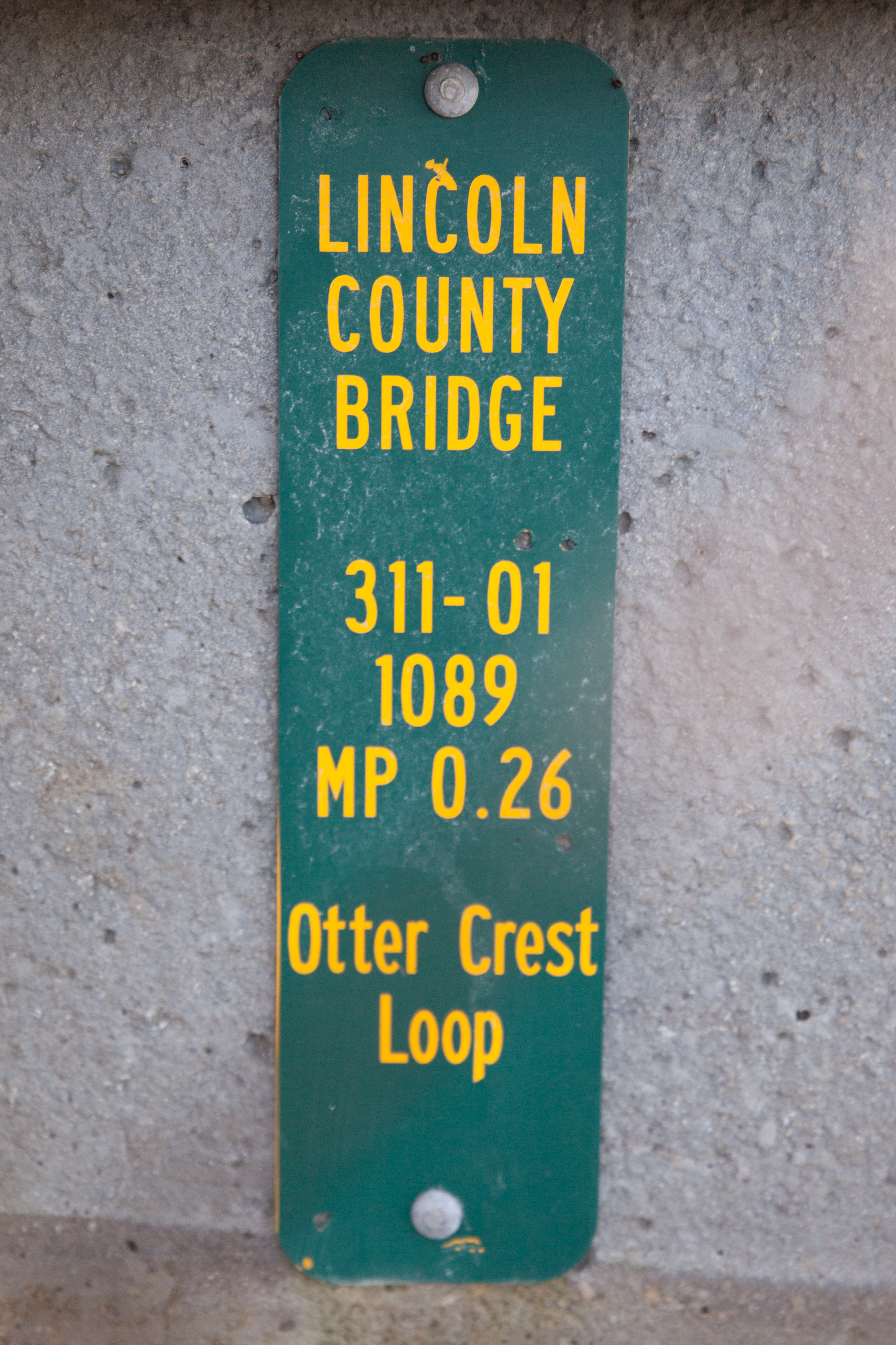 A bridge inventory marker for the Rocky Creek Bridge, also known as the Ben Jones Bridge, over Rocky Creek at MP 0.26 on Otter Crest Loop (Old US-101, now Lincoln County #311) south of Depoe Bay.