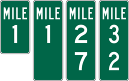 - Green MUTCD D10-2 mileposts for 1- and 2-digit numbers, marked at whole miles